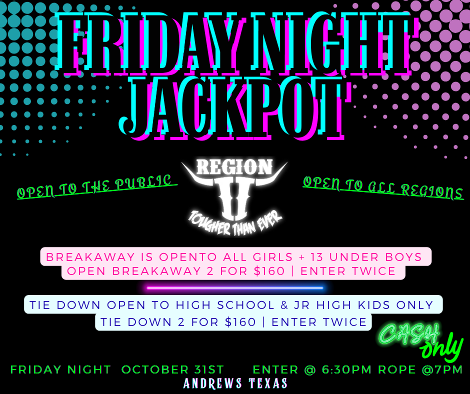 Back to All Events Friday Night Jackpot Friday, October 31, 2025 6:30 PM Friday, February 27, 2026 7:30 PM THSRA Region 2 - Kelly Wood 4994 County Road 360 Hawley, TX, 79525 United States (map) Google Calendar ICS